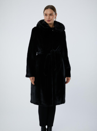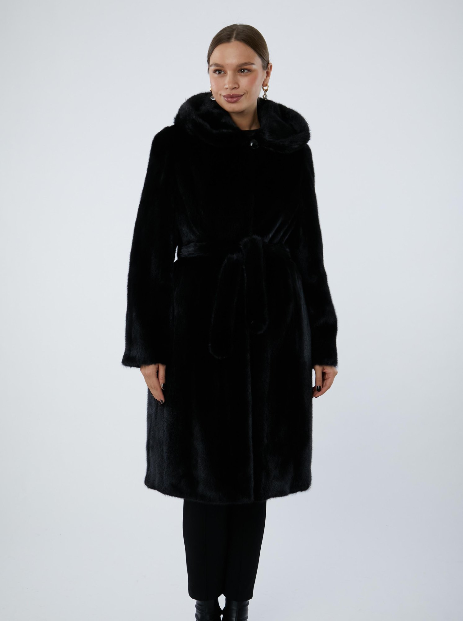 Удлиненная шуба из меха норки черного цвета с теплым капюшоном в форме капора. Модель прямого силуэта с фронтальной застежкой на шубные крючки. Прорезные карманы с боковым входом. Втачные рукава с кулисой. В комплекте имеется меховой пояс, что позволит выгодно подчеркнуть талию. Для удобства движения, шуба дополнена боковыми разрезами.