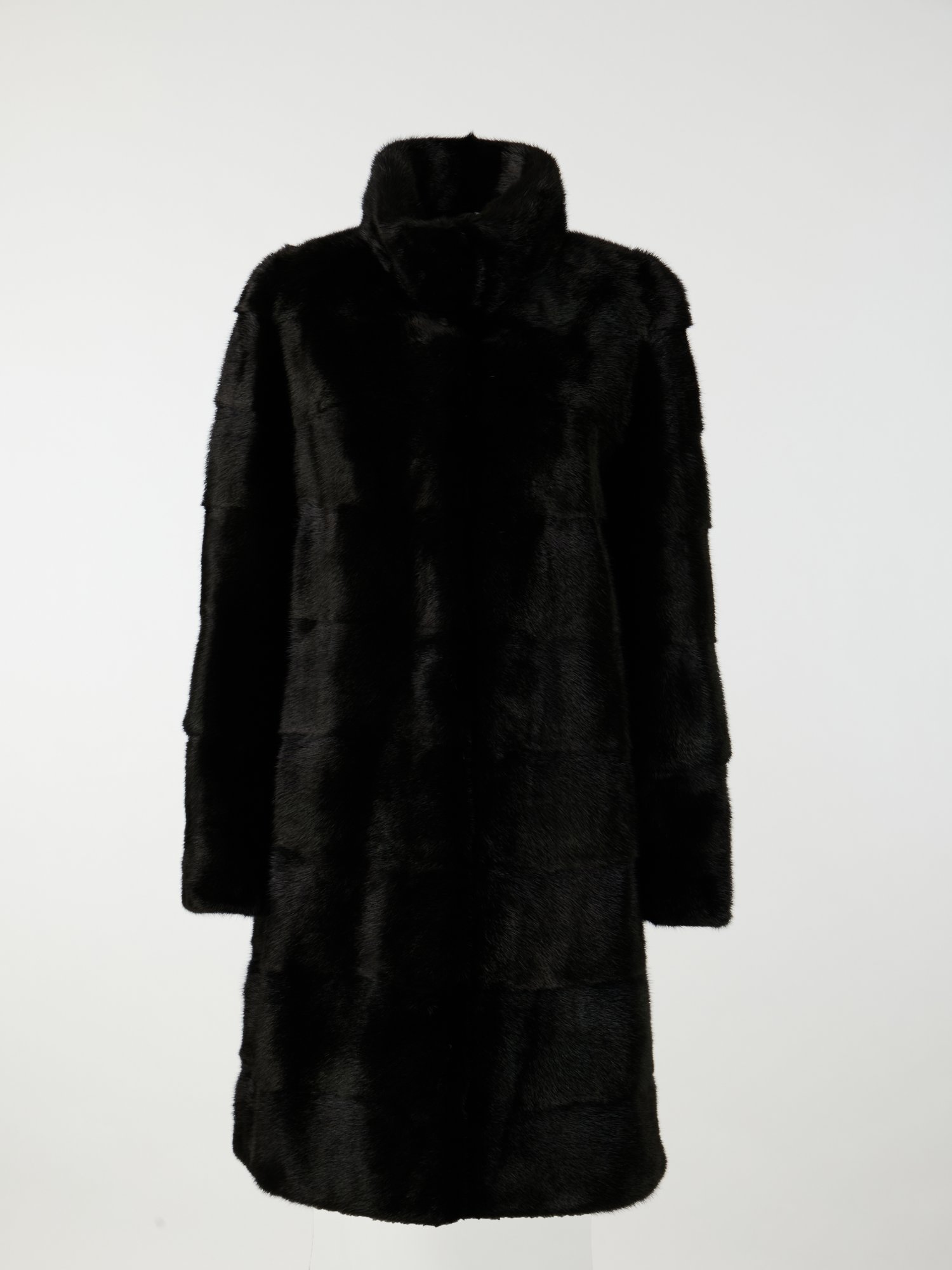 Шуба из меха норки черного оттенка с воротником стойкой. Модель прямого силуэта с поперечной раскладкой меха. Фронтальная застёжка на шубные крючки. Прорезные карманы с боковым входом. Втачные рукава со съёмной манжетой и кулисой. Наличие внутренней кулисы позволит выделить линию талии.