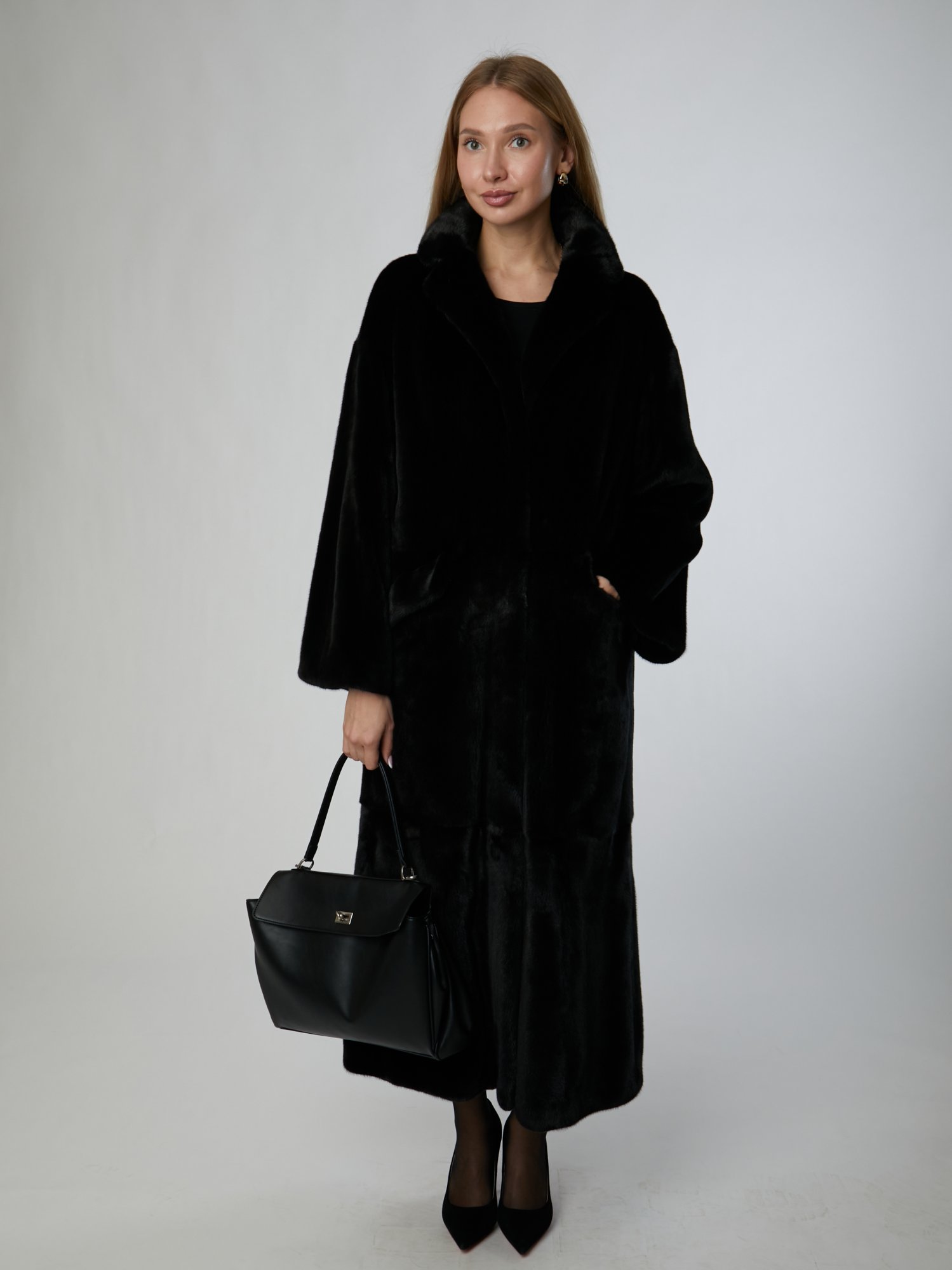 Стильная шуба из аукционного меха норки "BLACKGLAMA" с английским воротником. Модель прямого силуэта с фронтальной застежкой на шубные крючки. Втачные рукава со спущенной линией плеча. Для удобства движения изделие дополнено шлицей. Дополняет дизайн изделия декоративный хлястик, который крепится с помощью пуговиц. Внутренняя кулиса позволит выгодно подчеркнуть талию.