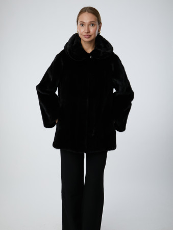 Укороченная шуба из меха норки черного оттенка с теплым капюшоном. Модель А-силуэта с фронтальной застежкой на шубные крючки и верхнюю пуговицу. Рукава регланом с фиксирующей кулисой. Прорезные карманы с боковым входом.