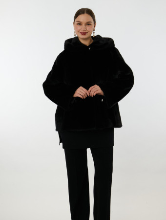 Укороченная шуба из меха норки черного оттенка с теплым капюшоном. Модель А-силуэта с фронтальной застежкой на шубные крючки и верхнюю пуговицу. Рукава регланом с фиксирующей кулисой. Прорезные карманы с боковым входом.