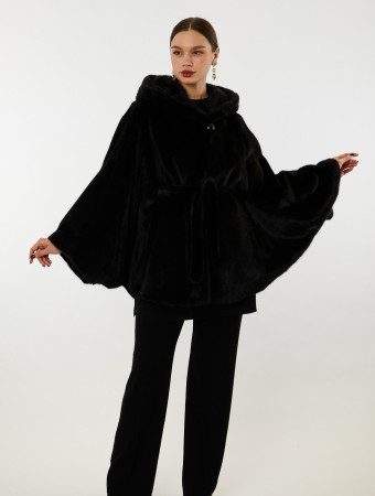 Укороченная шуба "летучая мышь" из аукционного меха норки чёрного оттенка с капюшоном. Модель свободного силуэта с застёжкой на крючки, прорезными карманами и цельнокроенным рукавом. Наличие мехового пояса позволит выгодно подчеркнуть талию.