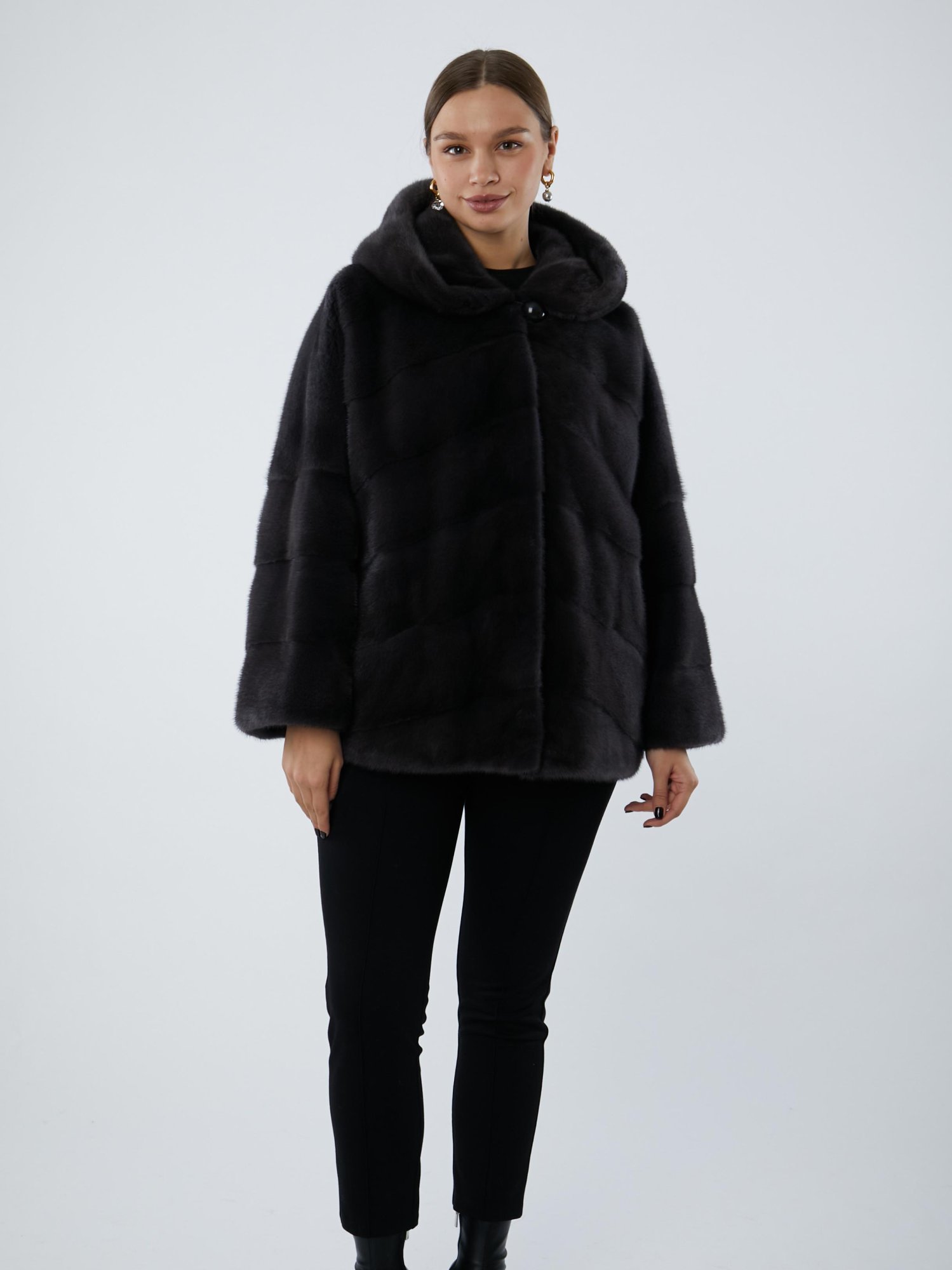 —Укороченная шуба из меха норки с капюшоном