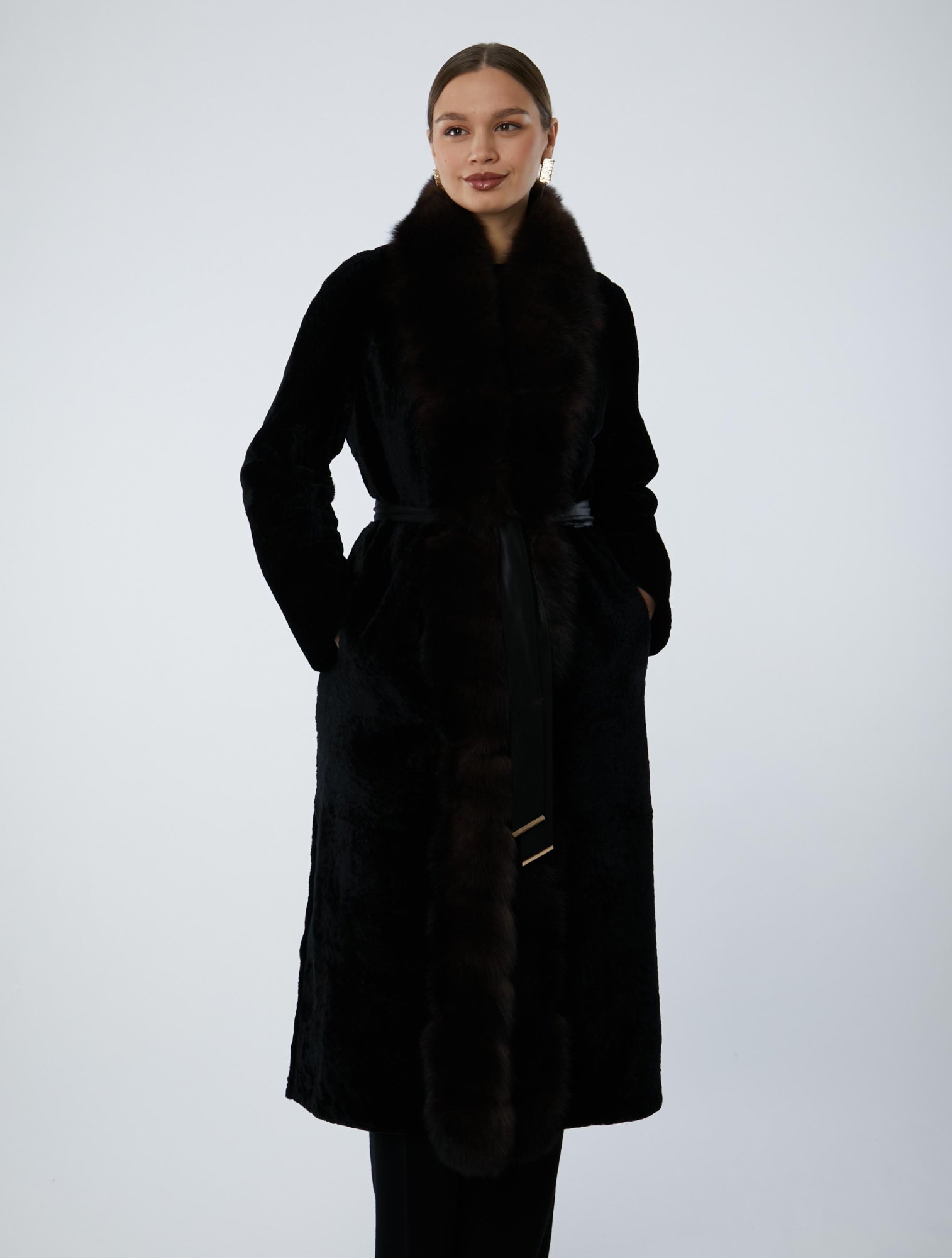 Длинная шуба из астрагана с шалевым воротом