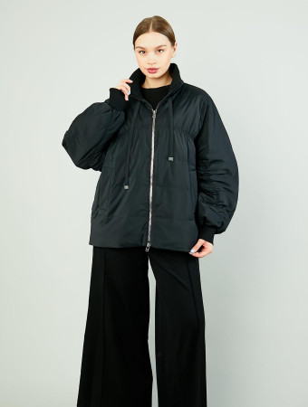 Утепленная куртка на синтепоне с высоким трикотажным воротником стойкой, регулируемым по горловине с помощью кулисы. Модель прямого силуэта с фронтальной застежкой на двустороннюю молнию и регулируемой кулисой по низу изделия. Цельнокроенные рукава с трикотажной манжетой. Прорезные карманы с широкой листочкой.